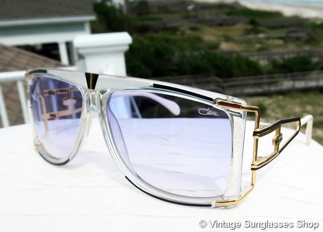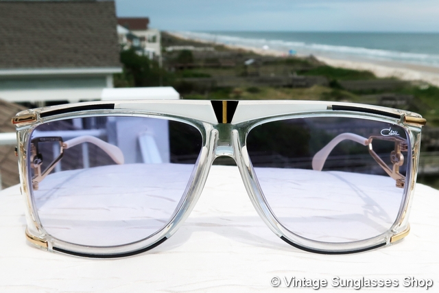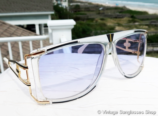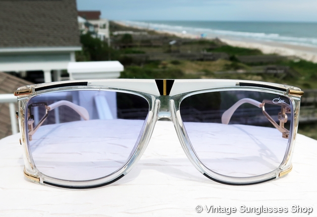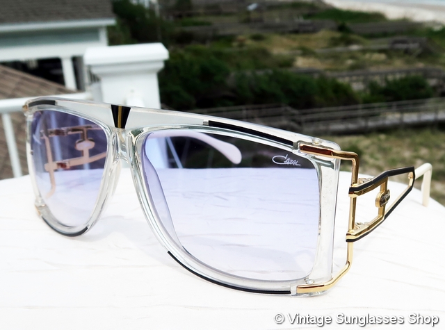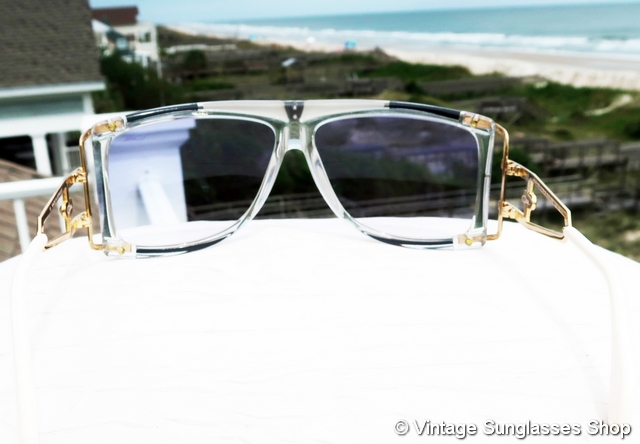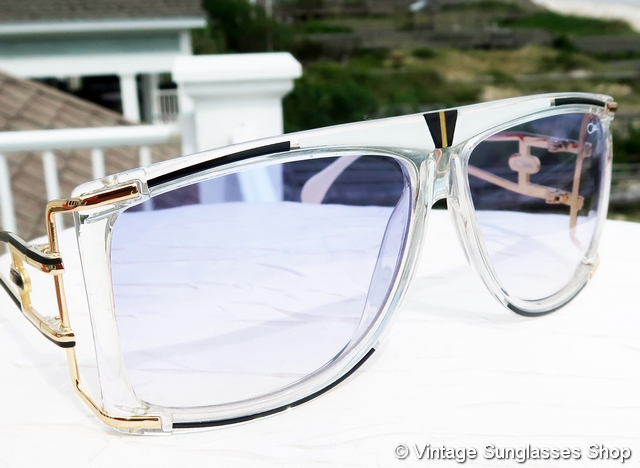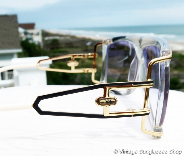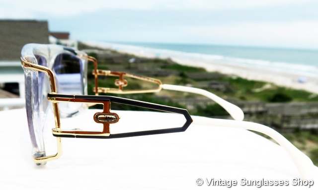 Vintage Cazal 866 645 sunglasses are a design and color explosion of clear, white, black, and gold in the Art Deco inspired styling of vintage Cazal 866 sunglasses, a style that was made in only very small quantities and thus very difficult to find today. The intricately crafted ear stems with their predominant colors of black and gold really stand out and make the Cazal 866 as striking from the sides as they are from the front. Tell