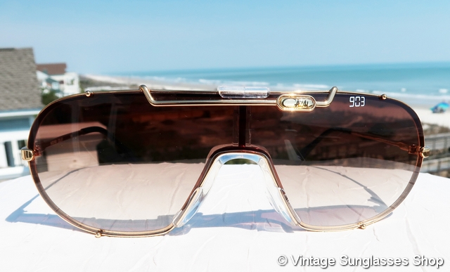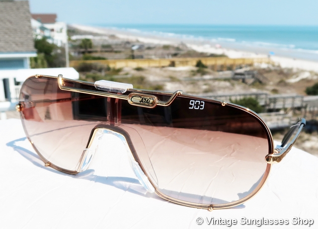 Vintage Cazal 903 97 sunglasses feature a distinctive and eye catching gold platedl frame in the elaborate, over the top style of Cazal founder Cari Zalloni and here coupled with equaly striking brown gradient lenses that all come together into one of the most sought after frame and lens combos among any vintage Cazal sunglasses. Cazal 903 sunglasses are an icon of modern sunglasses design c 1980s, pre-dating the reunification of East Germany with West Germany in 1990. Tell