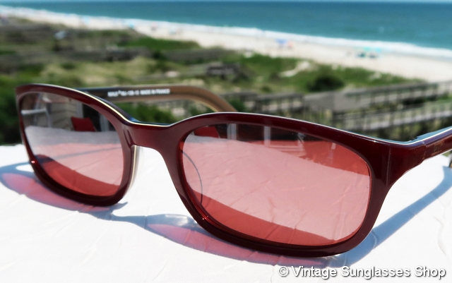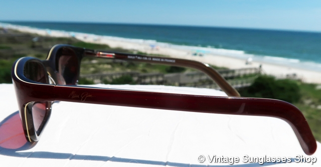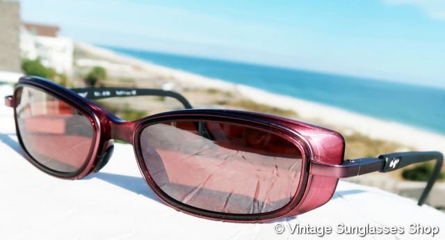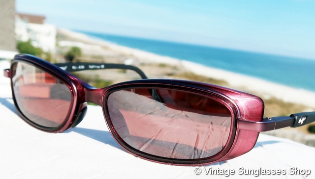 VS4034: Vintage Maui Jim MJ-138 13 Sunrise sunglasses were produced in only very small quantities, one of the only original Maui Jim styles produced in France. Don't miss the distinctive highlight lines on both the top and bottom of the distinctively shaped dark rose nylon frame. Completing the package are Maui Jim top gradient mirror mineral glass lenses, an eye catching complement to the rose burgundy frame. Tell