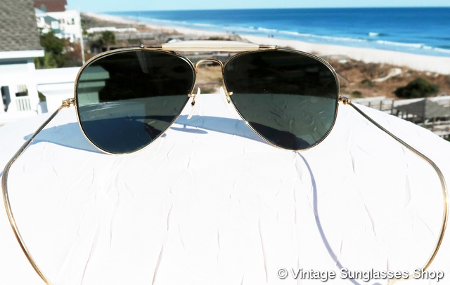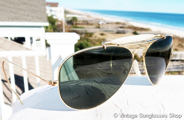 Vintage Ray-Ban 12k GF Outdoorsman shooter sunglasses were the top of the line gold plating in this icon of modern sunglasses design, coupled with Bausch & Lomb 58mm G-15 lenses that have made them the choice of everyone from pilots to celebrities the world over. The brow bar was designed to improve the balance of the sunglasses on the face, and the 12k gold filled frame has stood the test of time and will continue to do so given the high quality of original vintage B&L Ray-Bans. Tell