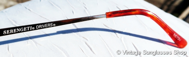 VS4045: Vintage Serengeti 5262 Vermilion Aviator sunglasses feature a sleek matte black racing inspired frame and top of the line rose Vermilion mineral glass lenses. Serengeti Vermilion lenses made by Corning Optics are "anti-reflection coated lenses" that set new standards for both looks and performance. Marketing literature from the period notes that "their built-in Spectral Control filters sharpen images for extraordinary visibility and eye comfort in all daylight weather conditions". Tell