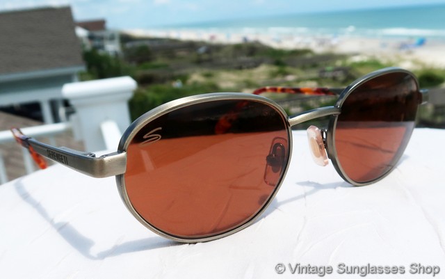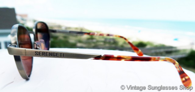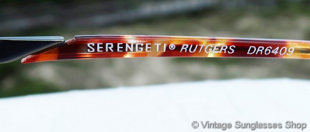 Vintage Serengeti 6409 Rutgers sunglasses from the Serengeti University collection feature the rare Bronze frame that's particularly distinctive with a light bronze front frame and eye cups that contour more closely to the face to eliminate wind and glare. The ear stems are equally distinctive, combining bronze and tortoise shell to make the 6409 look as good from the sides as from the front. Tell