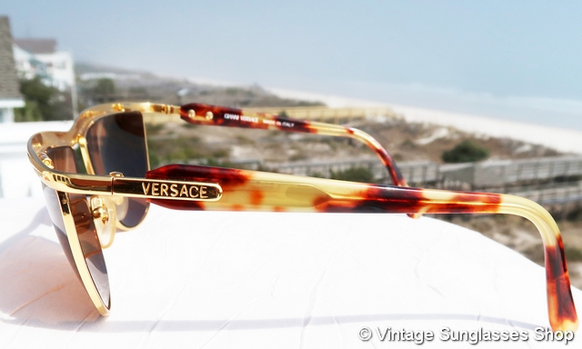 Vintage Versace S81 966 sunglasses are a moderately oversized style in the Versace line, with great curves and angles and more subtle design features like the extended temples. And of course you'll love the yellow tortoise shell ear stems of Versace S81 966 sunglasses, an enduringly popular style and color that looks great with the gold plated front frame and hinges. Tell
