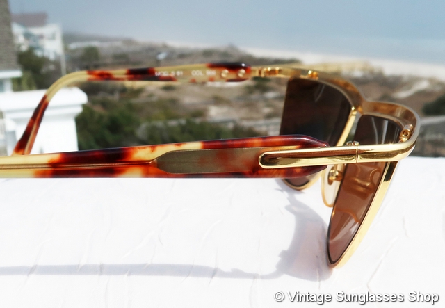 Vintage Versace S71 09M sunglasses are one of the icons of modern sunglasses design, with dark tortoise shell ear stems - almost black - featuring the intricately etched Versace Medusa Head in gold with black bacground emanel and coupled with gleaming gold plated hinges and nose bridge. This is a style that's been worn by celebrities from the movie, television, and sports worlds, and it exudes striking Italian quality and craftsmanship in every possible way. Tell