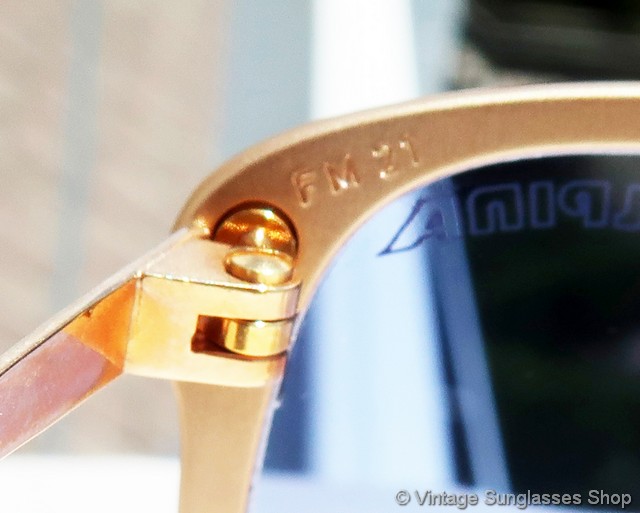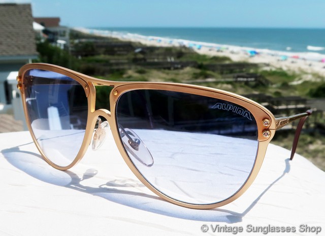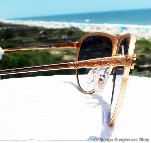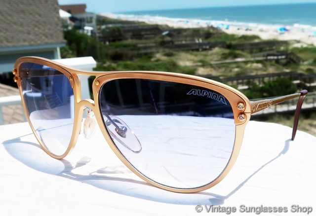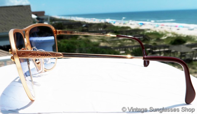 Vintage Alpina M3 FM 21 sunglasses feature an eye catching matte gold frame that gives the Alpina M3 FM 21 sunglasses their distinctive look, and in addition you get rare Alpina blue gradient lenses in this hard to find variation. Alpina M3 FM 21 sunglasses are the perfect alternative for those who like the look of the iconic Alpina M1 but but want a slightly smaller variation. It's a little softer, more rounded look with a narrower nose bridge, and the FM21 matte gold frame is one of the hardest to find in this well known Alpina style line of the 1980s and early 1990s. Tell